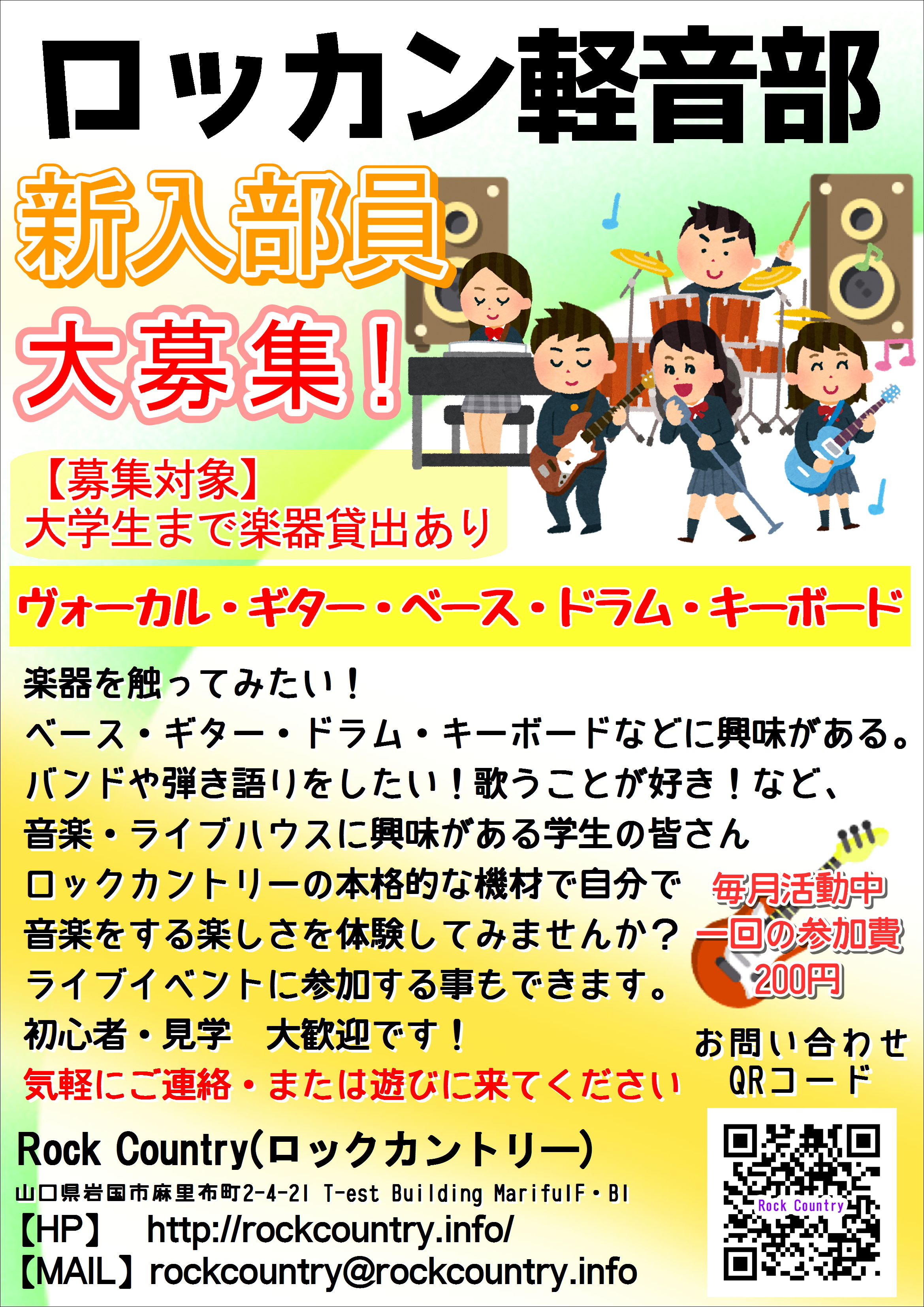 | ライブハウス・イベントスペース ロックカントリー ご入場有難う御座います ライブ・イベント情報 (EVENT SCHEDULE) 出演者随時募集中!イベント情報随時更新中! スタジオ予約カレンダー (STUDIO RESERVATION & EVENT CALENDER) スタジオ予約の情報を手軽にご確認できます YouTube CHANNEL ロックカントリーから発信する映像コンテンツをお楽しみください 貴重なライブアーカイブ・ライブ配信・企画番組など WEB SHOP ロックカントリーオリジナルグッズなど販売中! 是非ご訪問ください! オーナーブログ ロッカンの最新情報&機材紹介 プライベート情報をUPしてます ロッカン軽音部部員募集中! 見学・お問合せはお気軽に。 初心者大歓迎! 楽器を持っていない方お貸しします |